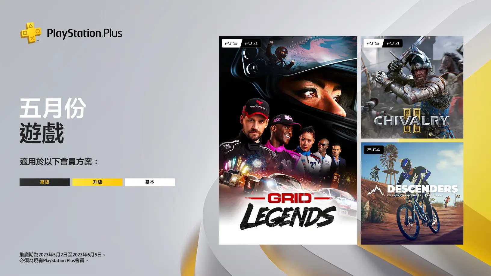 五月份的PS Plus 訂閱遊戲陣容:《GRID Legends 極速房車賽》、《Chivalry 2 騎士精神2》與《Descenders 下坡競速王者》