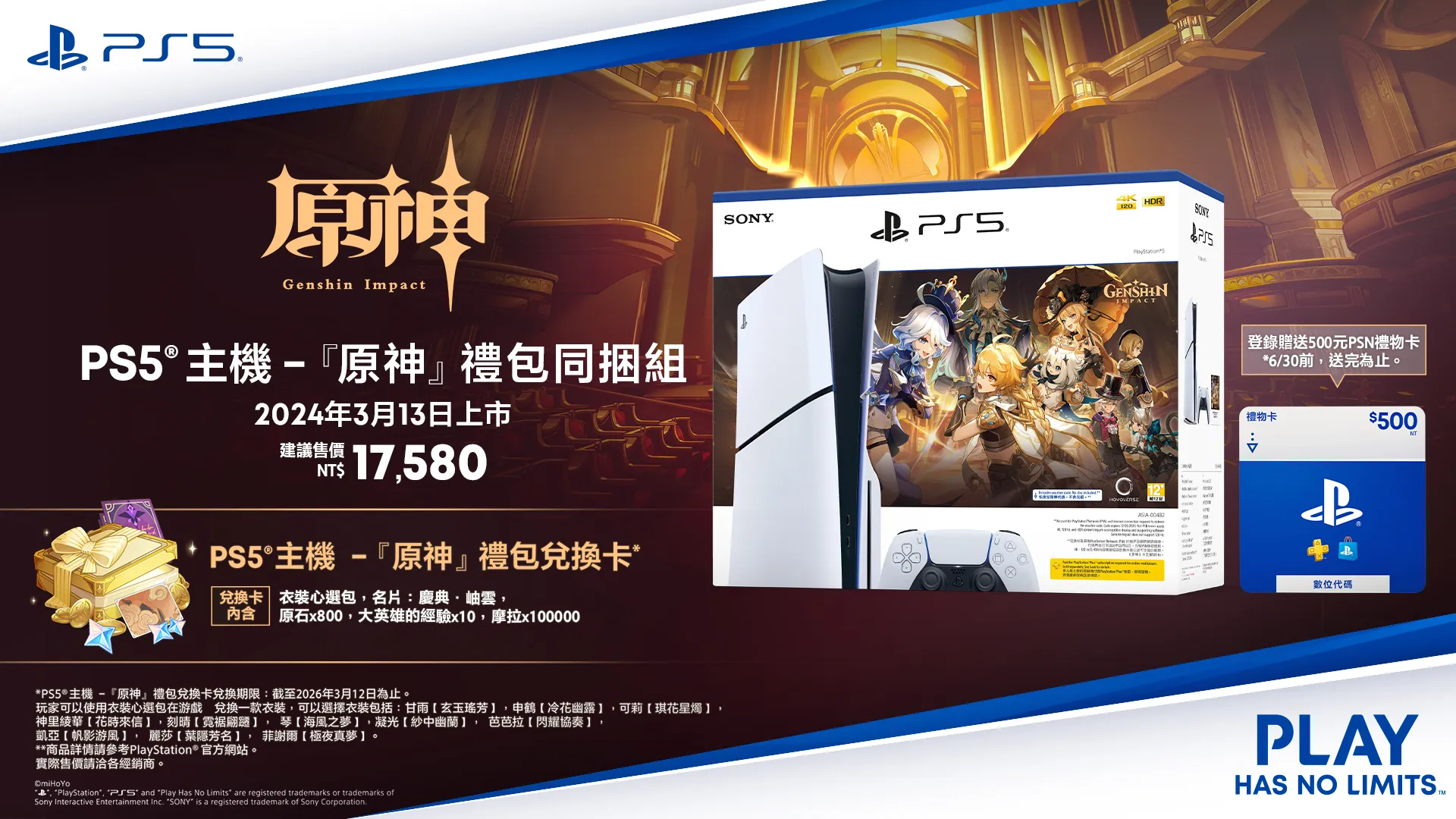 啟動!買PS5 主機 -『原神』禮包同捆組 登錄送500元PSN禮物卡