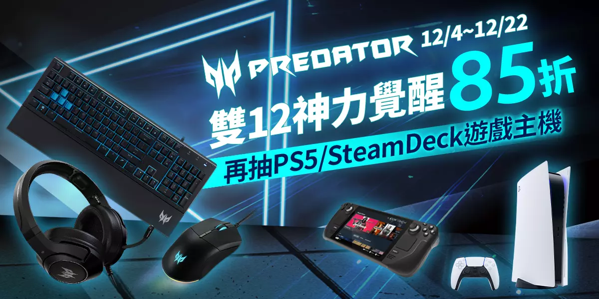 PREDATOR 雙12神力覺醒🔥全品項85折,再抽PS5、SteamDeck 遊戲主機🎁